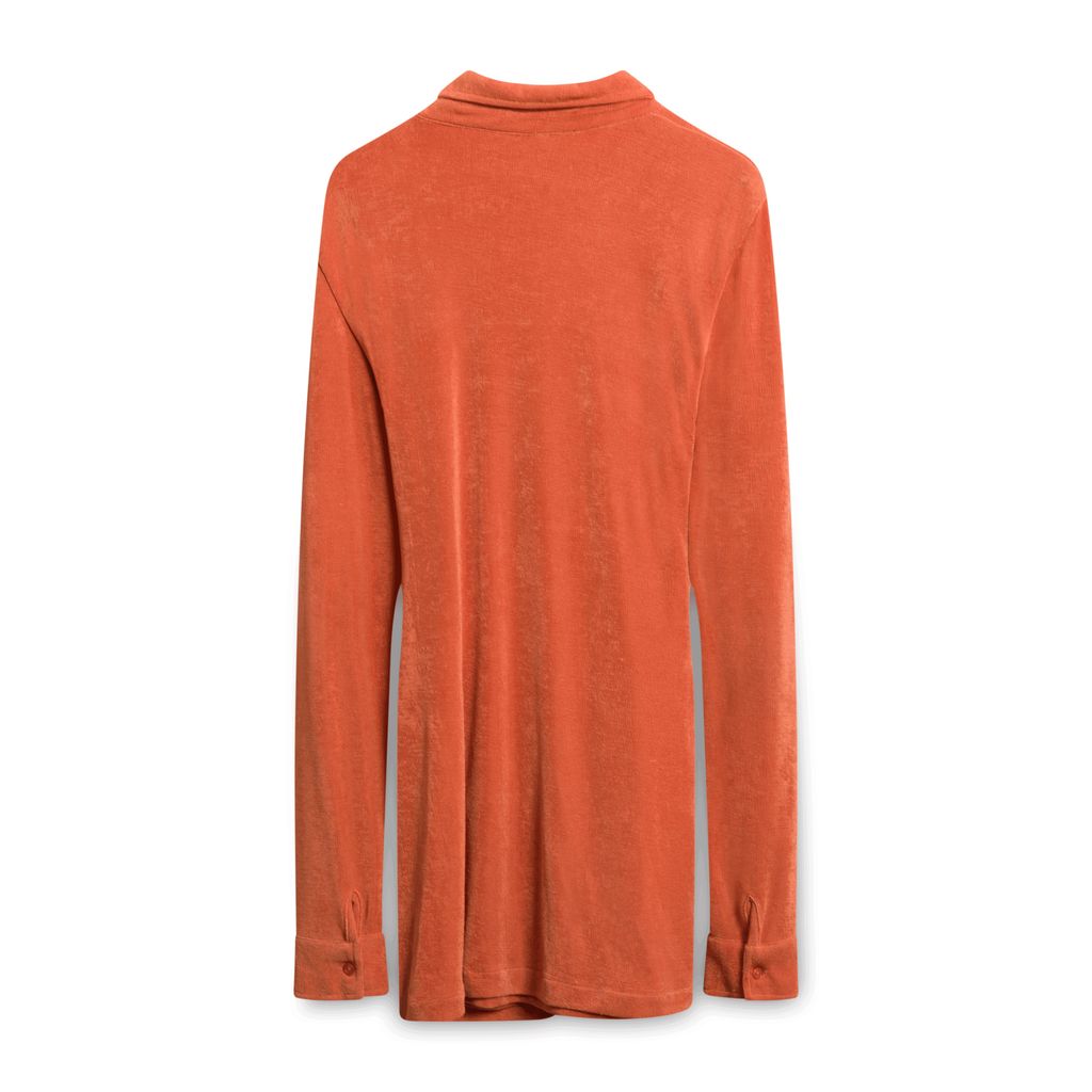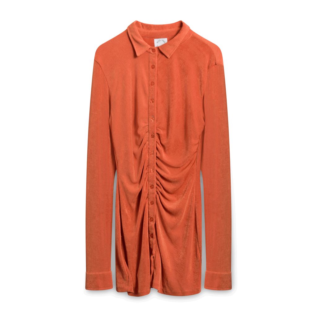 The Andy is a long sleeve mini dress featuring a ruched waist and button-through front.