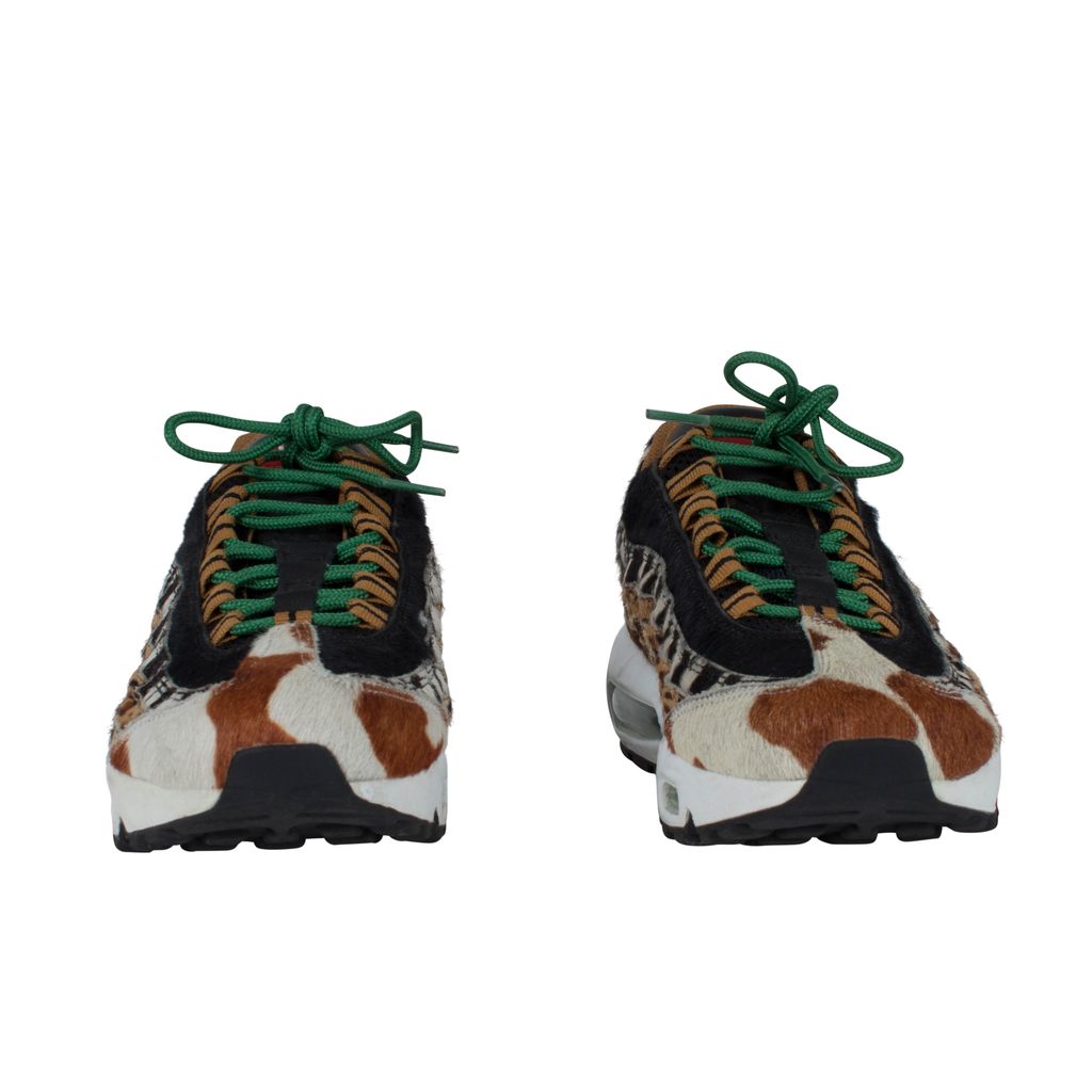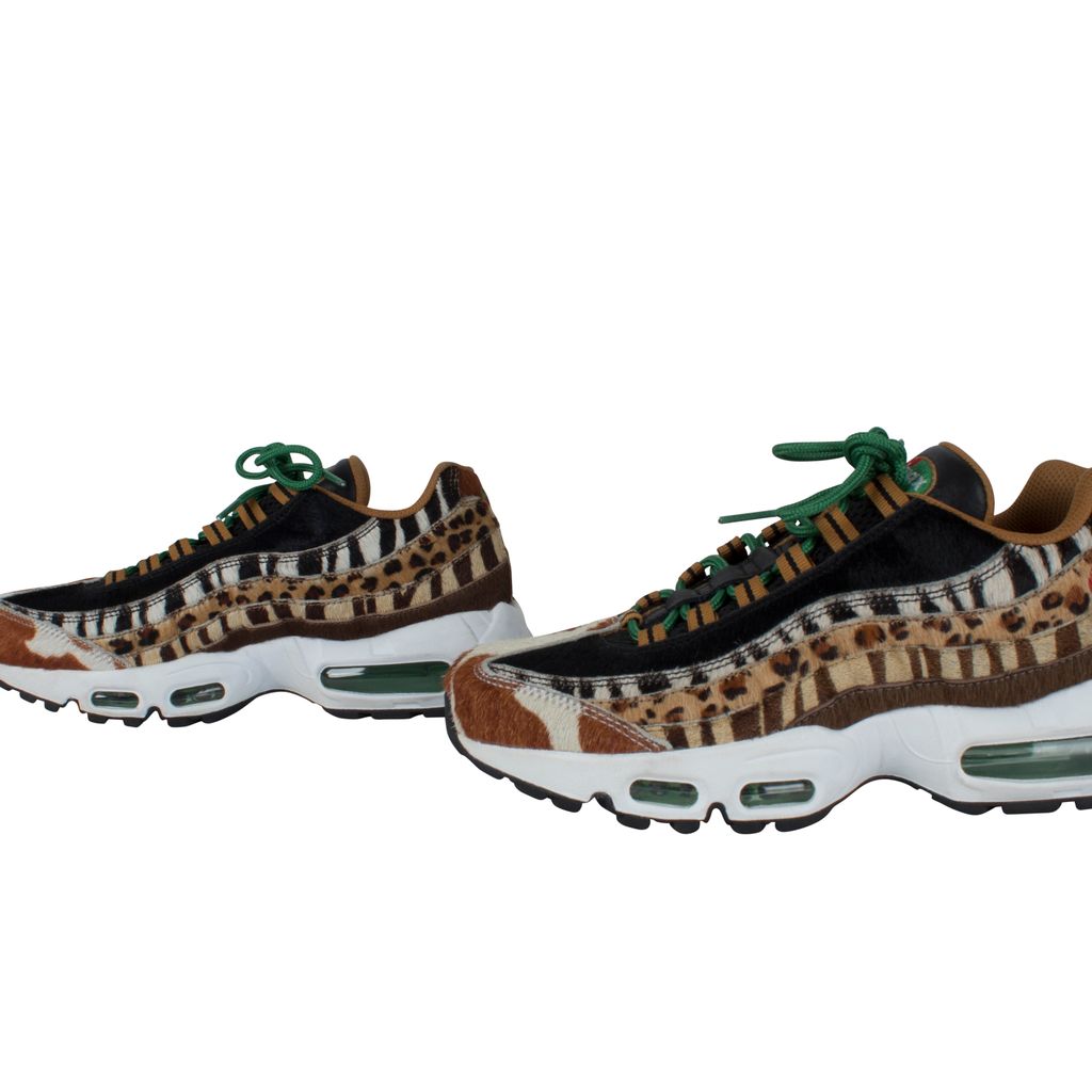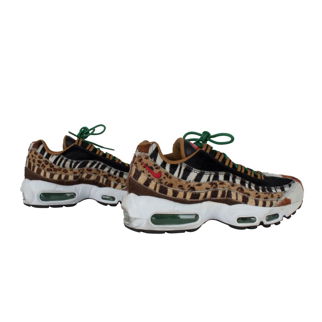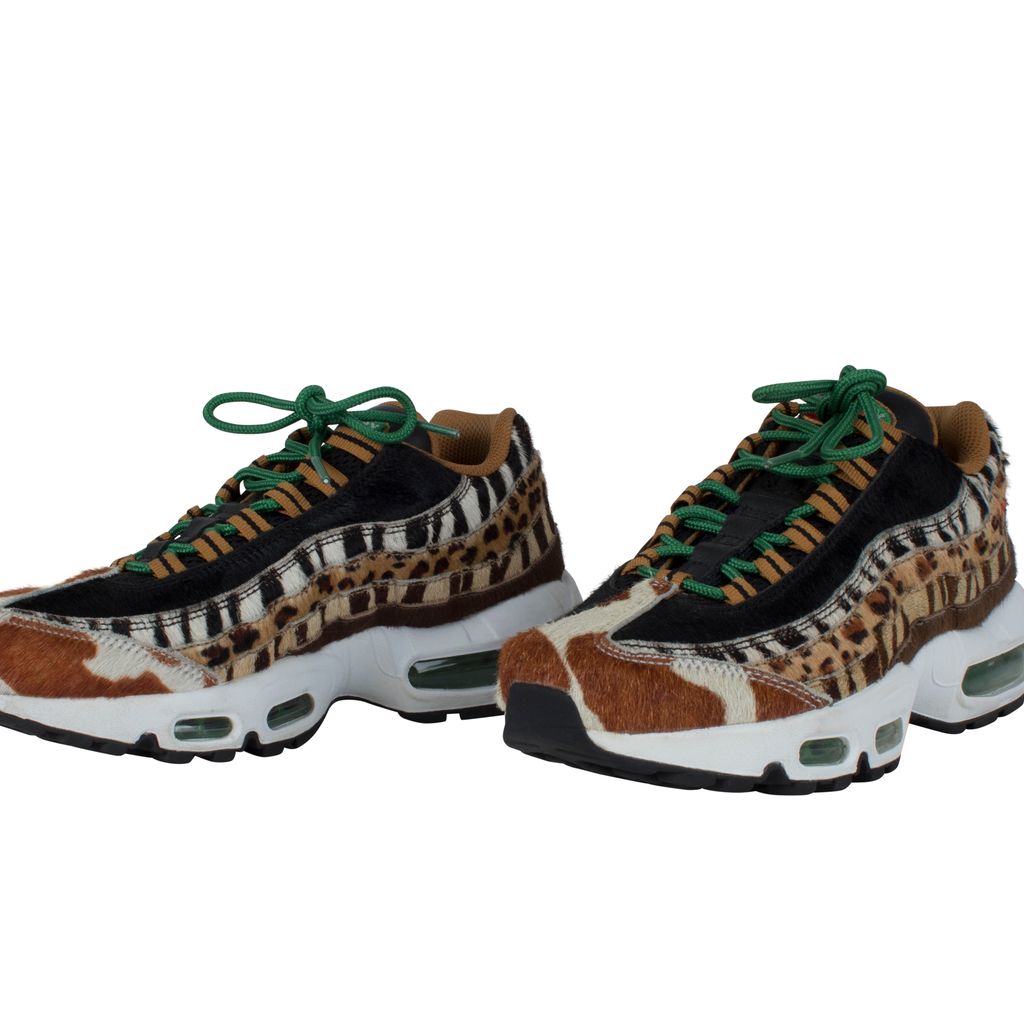 Walk on the wild side in the Nike Air Max 95 Animal Pack. Atmos designer Koji displays a zoo of animal prints on the upper - tiger, leopard, zebra and pony - to create looks that will undeniably stand out in a crowd. Rich suede materials and dramatic black detailing bring out the wild side of the human-anatomy-inspired Air Max 95, while red, white and green accents complete the animal-inspired design by atmos. Gently worn, marks and scuffs as pictured.