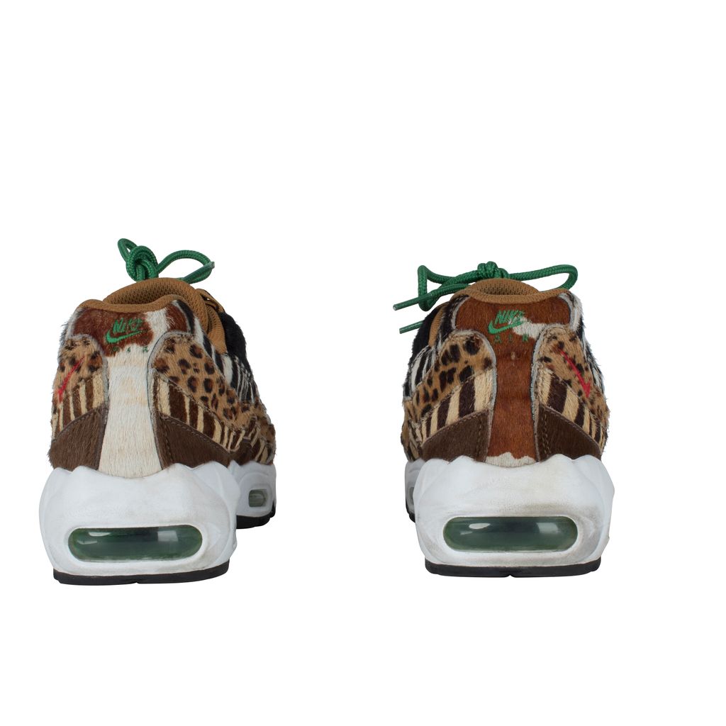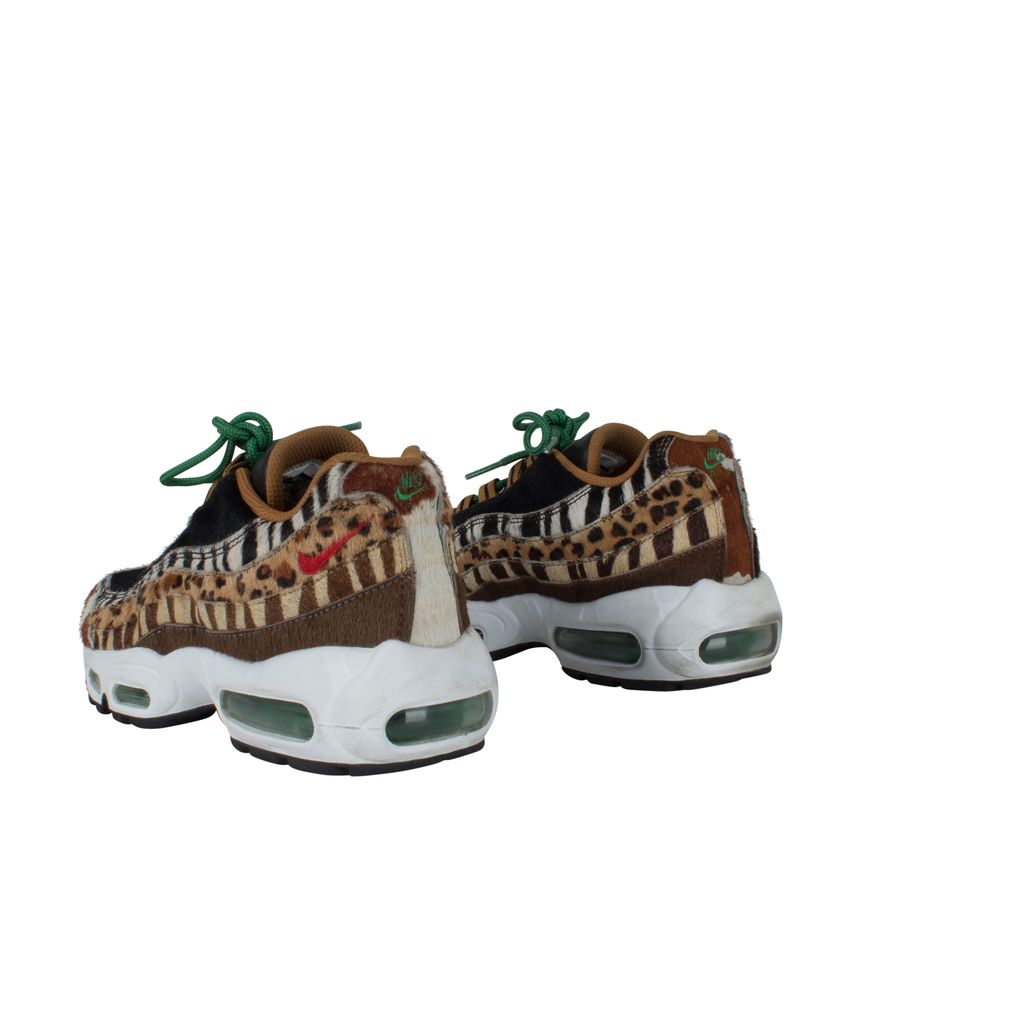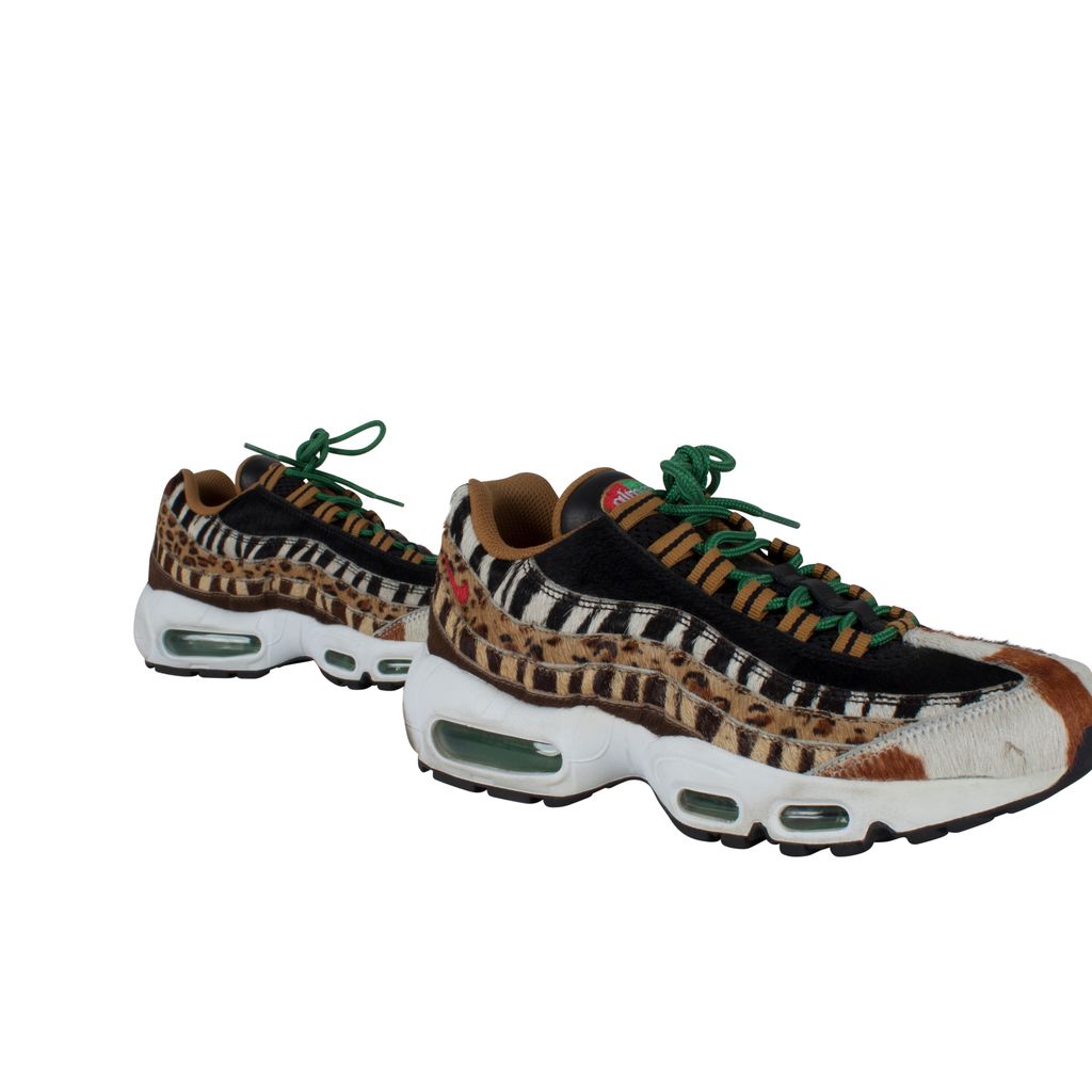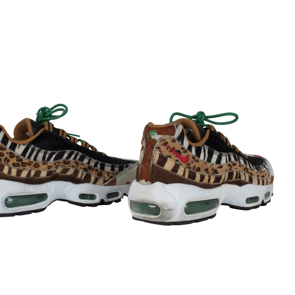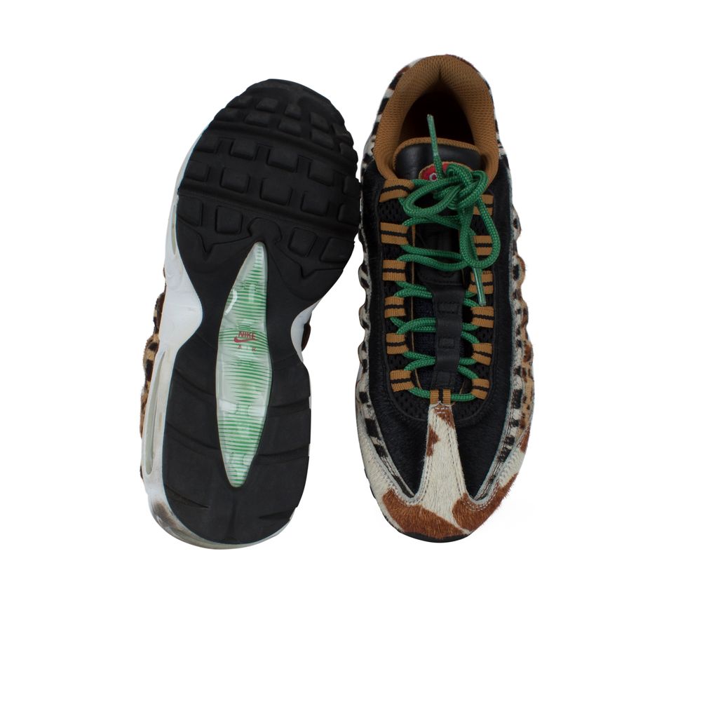 Walk on the wild side in the Nike Air Max 95 Animal Pack. Atmos designer Koji displays a zoo of animal prints on the upper - tiger, leopard, zebra and pony - to create looks that will undeniably stand out in a crowd. Rich suede materials and dramatic black detailing bring out the wild side of the human-anatomy-inspired Air Max 95, while red, white and green accents complete the animal-inspired design by atmos. Gently worn, marks and scuffs as pictured.