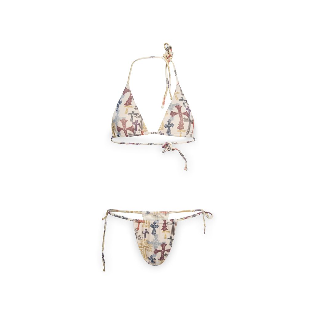 Worship Her Bikini in Beige features divine mesh with lining, triangle top, bottoms with side ties, and all over print.