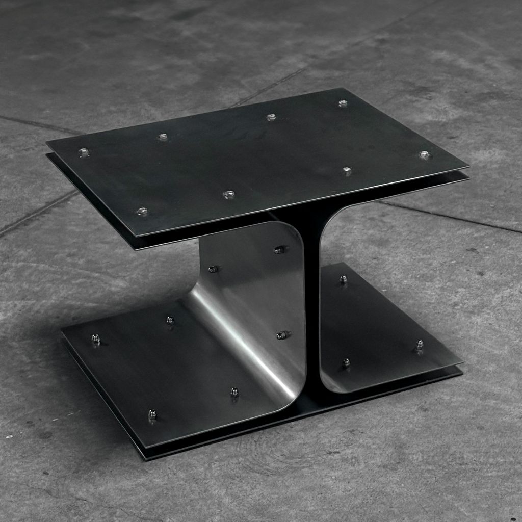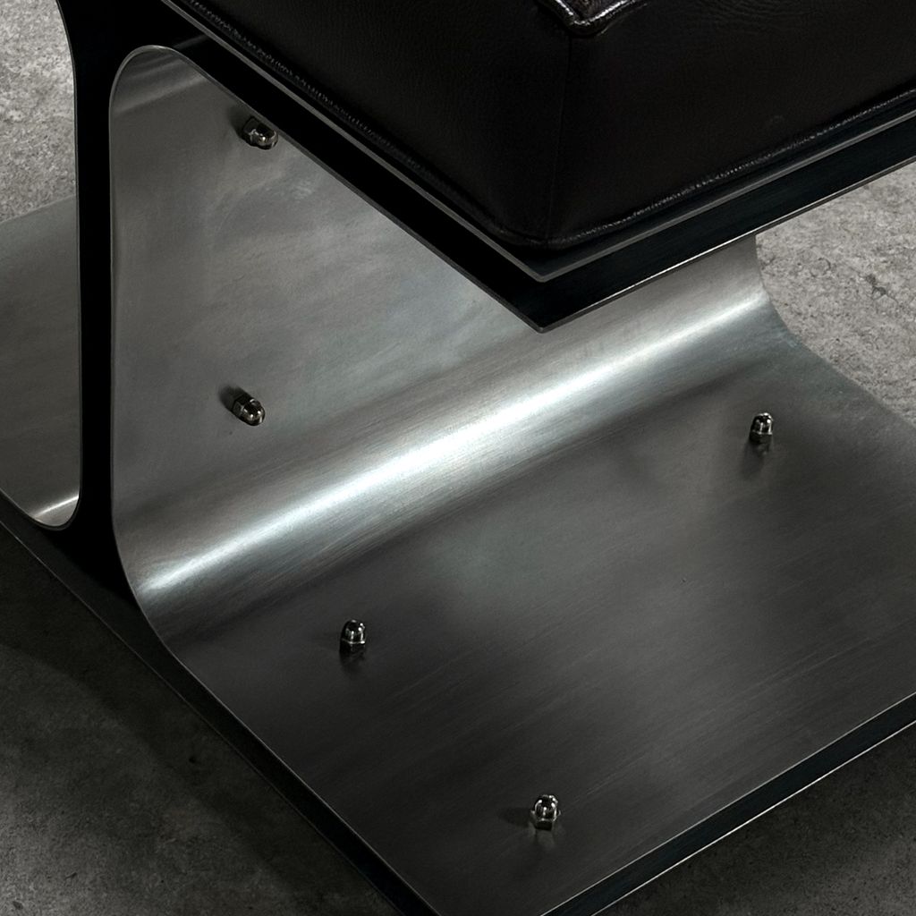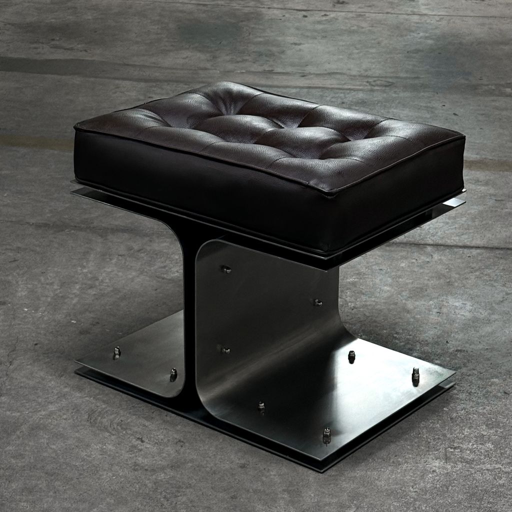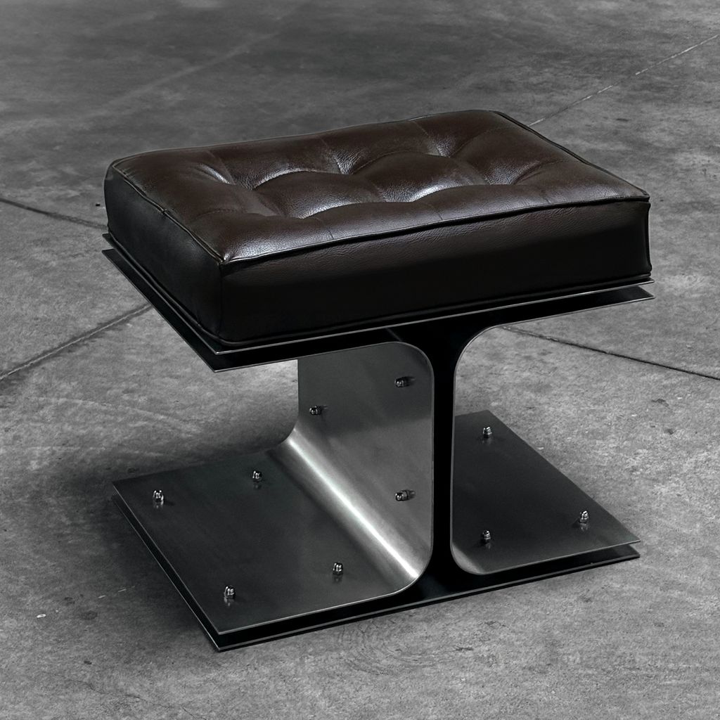 This ottoman is designed and manufactured by NAVE & STUHL in Ecuador, constructed from four individual stainless steel sheets, each precisely cut, bent, and assembled using exposed metal bolts. The plates never touch—held apart to create a structural void that casts a continuous shadow, emphasizing both separation and support. This deliberate spacing highlights the construction logic while celebrating the raw expression of the fasteners. A tufted brown leather cushion rests lightly on top, creating a striking contrast between the softness of the upholstery and the cold precision of the steel below.