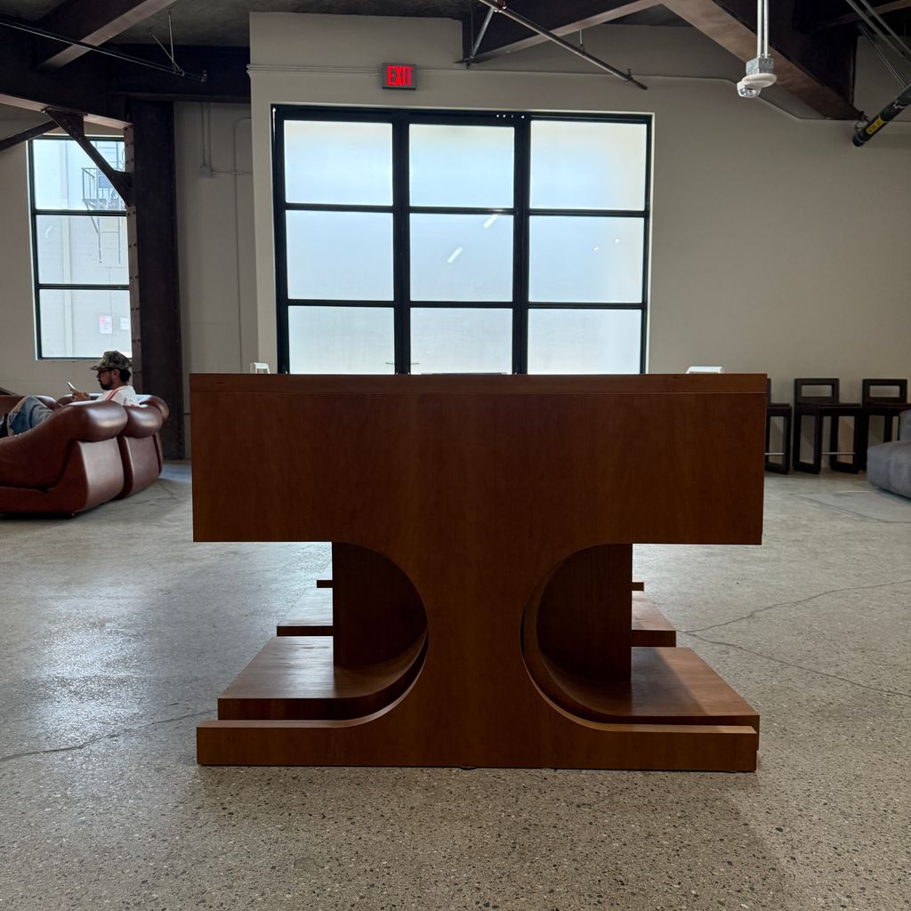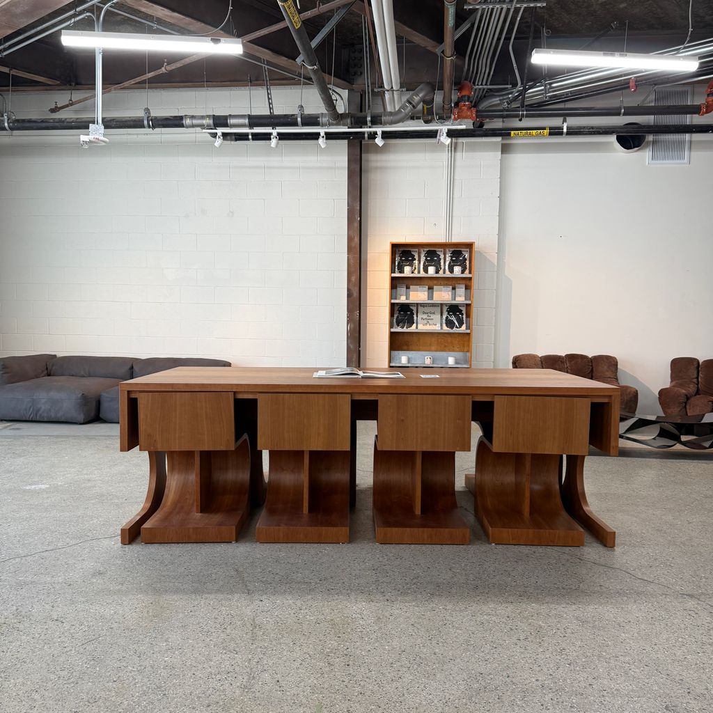 Designed and manufactured by Willett, the table and chair set features bent plywood with wood veneer. Willett is a design company that focuses on furniture and spaces, spanning across custom, art, and in-line pieces, with a design language that pays homage to 20th-century modernism.