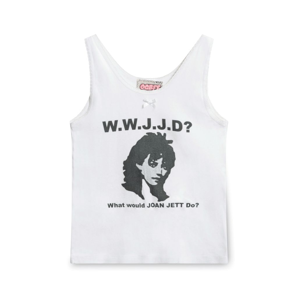 White tank top with a scoop neckline and lace at the neck and arms. A graphic of Joan Jett along with W.W.J.J.D, both in full text and abbreviation, is printed on the front. A small bow is also featured above the graphic.