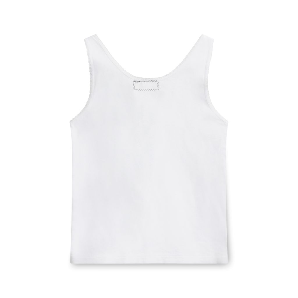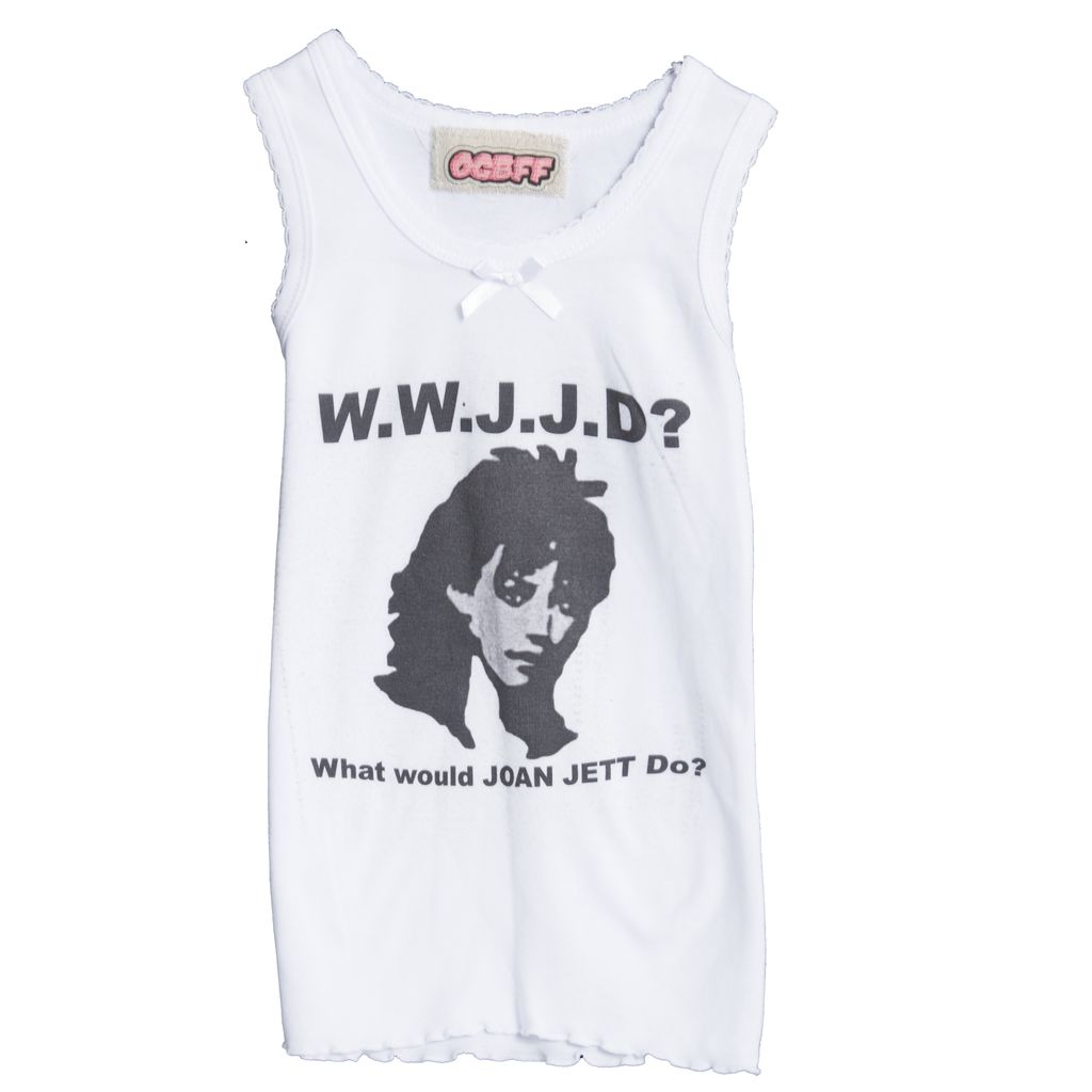 White tank top with a scoop neckline and ruffles at the neck and arms. A graphic of Joan Jett along with W.W.J.J.D, both in full text and abbreviation, is printed on the front. A small bow is also featured above the graphic.