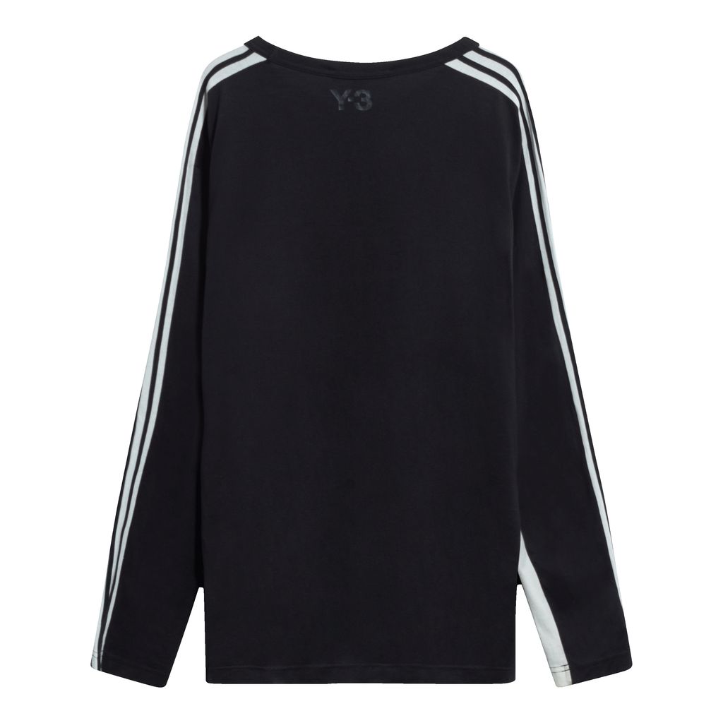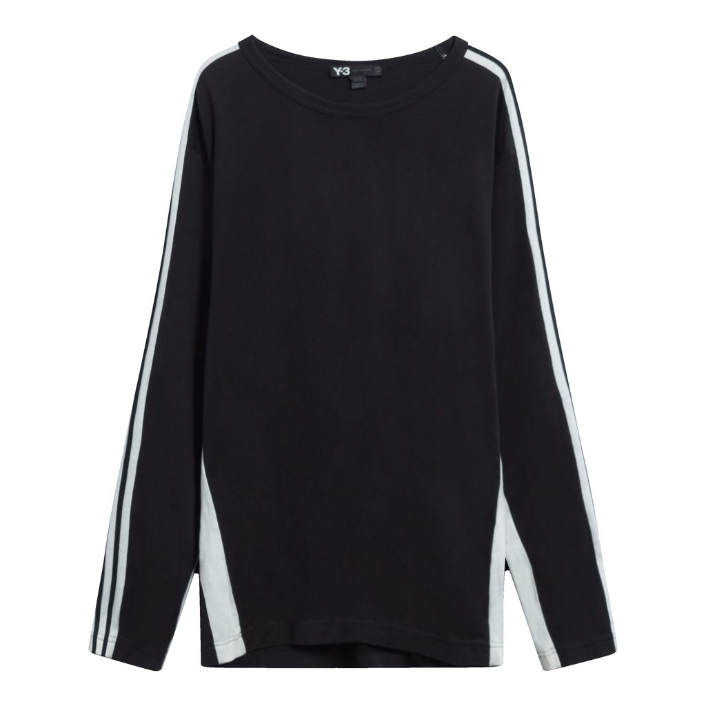 Gently worn, black three stripe long sleeve from Y-3. Features embroidered stripe paneling design down sleeves, color blocked white panel under arms and screen print back tag logo.