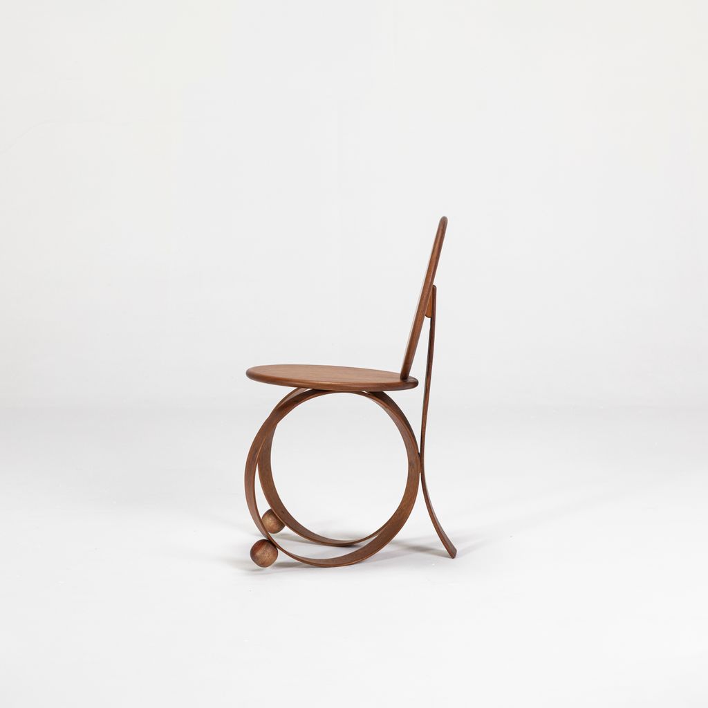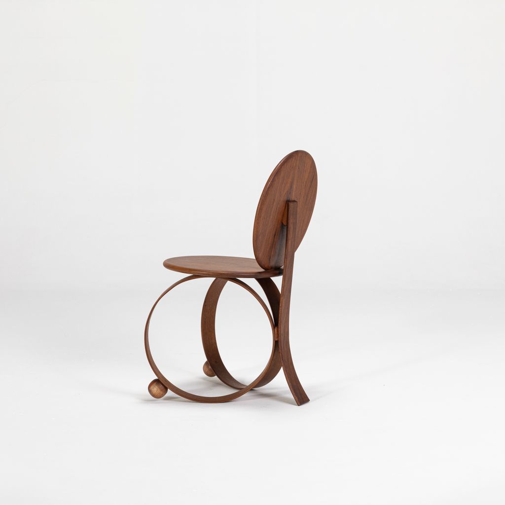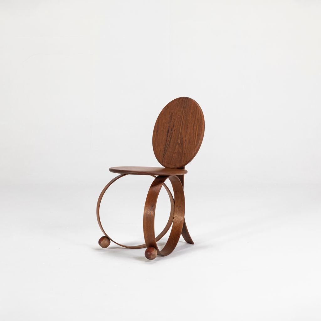Yara emerged as a result of research into steam-bending wood conducted by the studio in 2022. This is a legless chair, supported by two circles of solid wood that have been steam-bent. Yara is a flexing chair, with its entire structure reacting proportionally to the weight of the sitter, changing and adapting together. A disruptive piece, its sculptural form, simple lines, and the combination of its elements challenge the conventional status of a chair.
