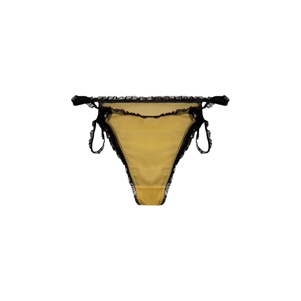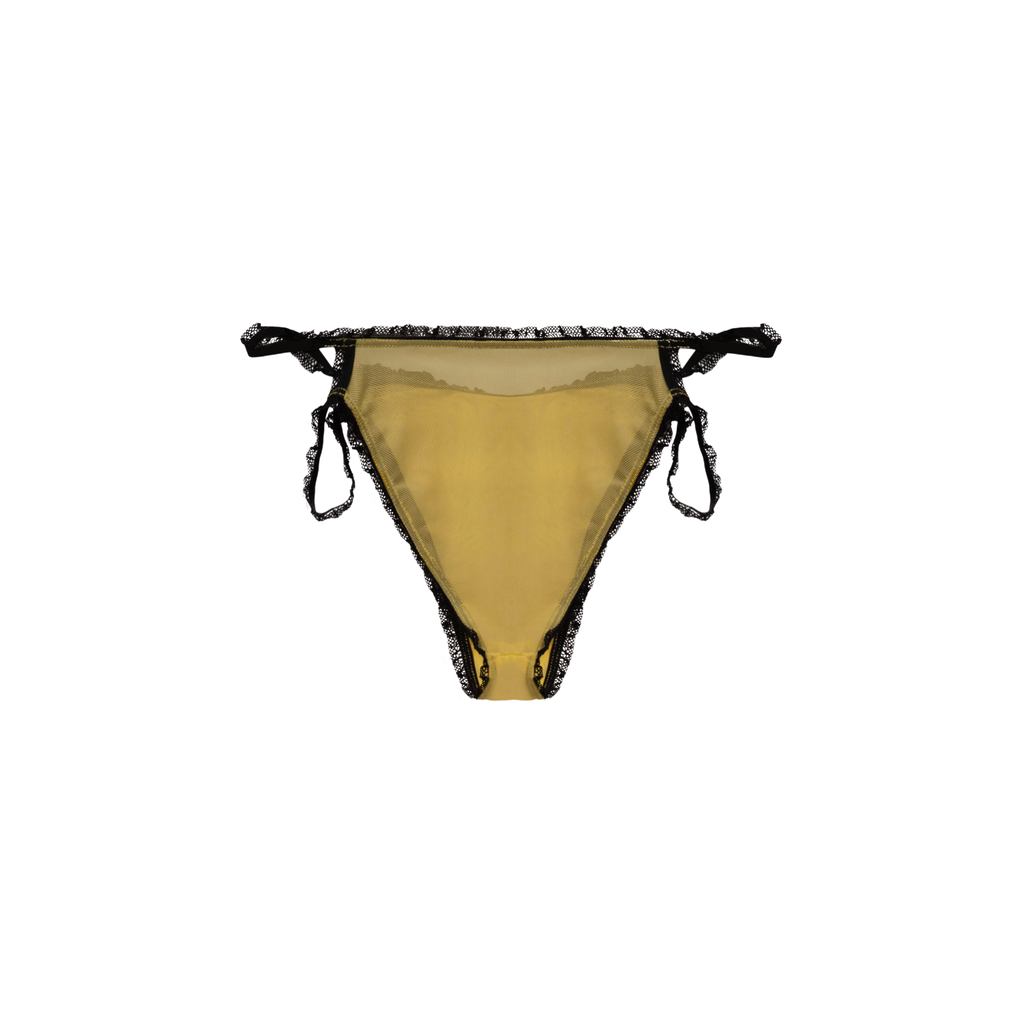 Yellow and black Lole Bikini features lace ruffled elastic, black satin bows, and velvet star pattern on mesh fabric.