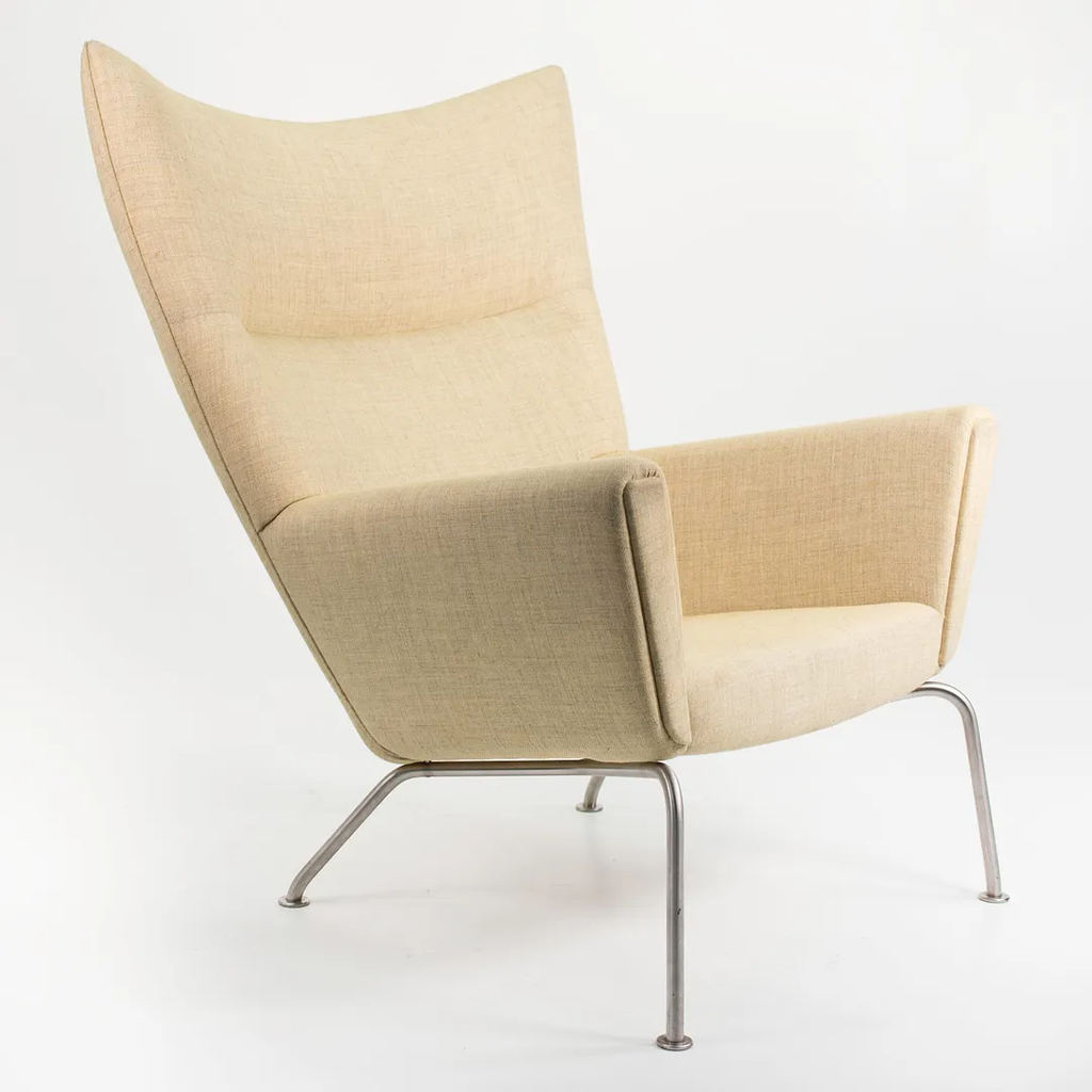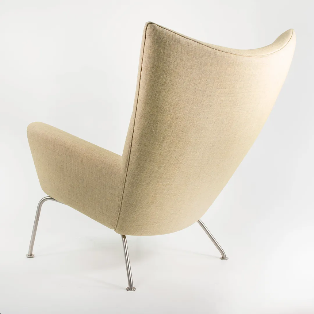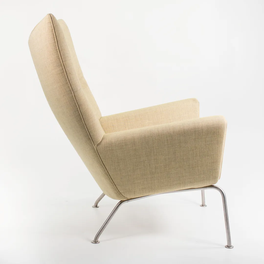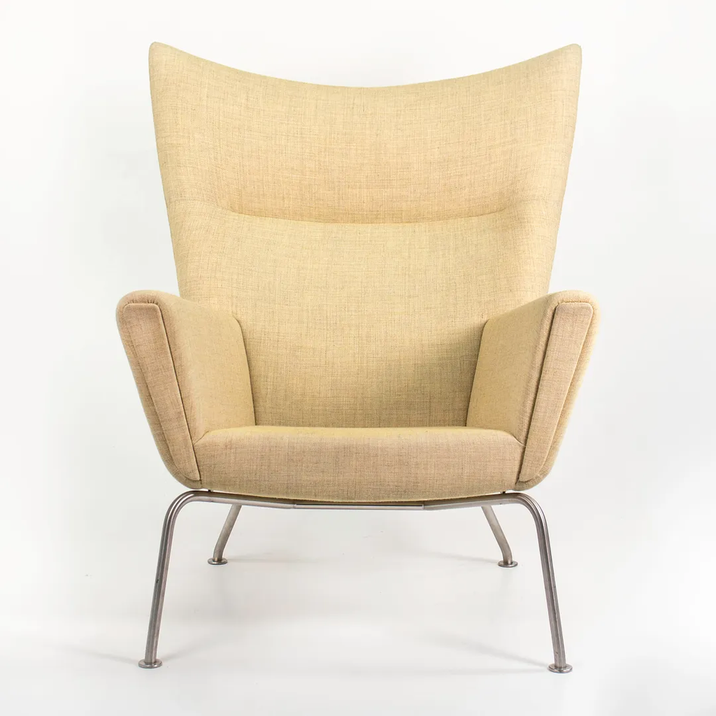 Listed for sale is a CH445 Wing Lounge Chair made with a stainless steel frame and light yellow fabric. The chair was designed by Hans Wegner and produced by Carl Hansen & Son in Denmark. The chair dates to circa 2020 and is guaranteed as authentic. Condition is excellent overall and may show light wear only from storage and transportation to our warehouse. This chair has not been used in a home or office setting. See photos. The fabric appears to be a custom order from Carl Hansen, where an interior designer likely specified and sent in the Customer's Own Material (COM). Please note in the last photo, approximately 10 inches below the corner, there is a small imperfection on the fabric. See photos for condition otherwise also.