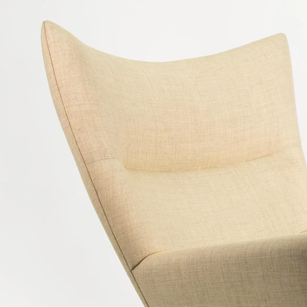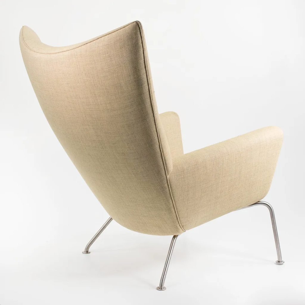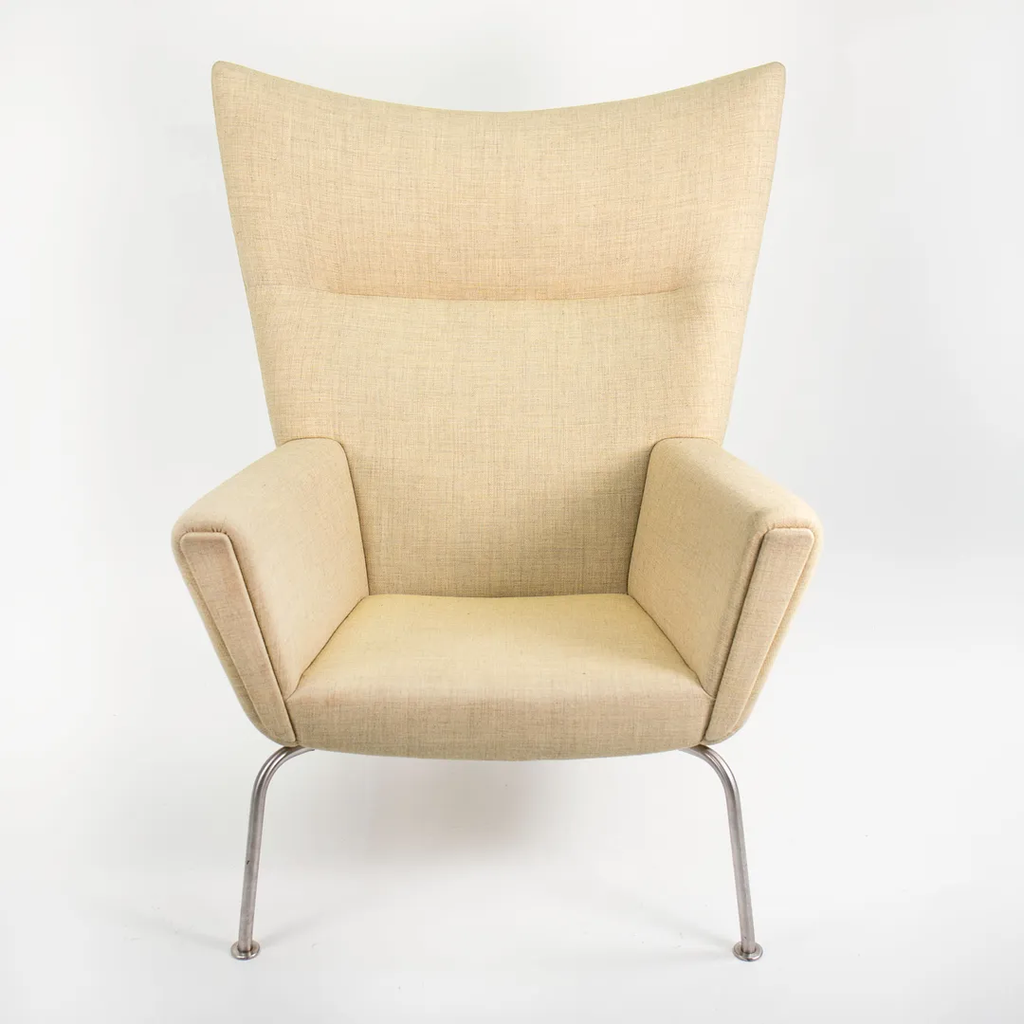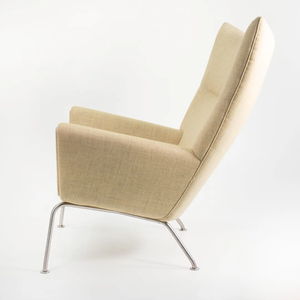 Listed for sale is a CH445 Wing Lounge Chair made with a stainless steel frame and light yellow fabric. The chair was designed by Hans Wegner and produced by Carl Hansen & Son in Denmark. The chair dates to circa 2020 and is guaranteed as authentic. Condition is excellent overall and may show light wear only from storage and transportation to our warehouse. This chair has not been used in a home or office setting. See photos. The fabric appears to be a custom order from Carl Hansen, where an interior designer likely specified and sent in the Customer's Own Material (COM). Please note in the last photo, approximately 10 inches below the corner, there is a small imperfection on the fabric. See photos for condition otherwise also.