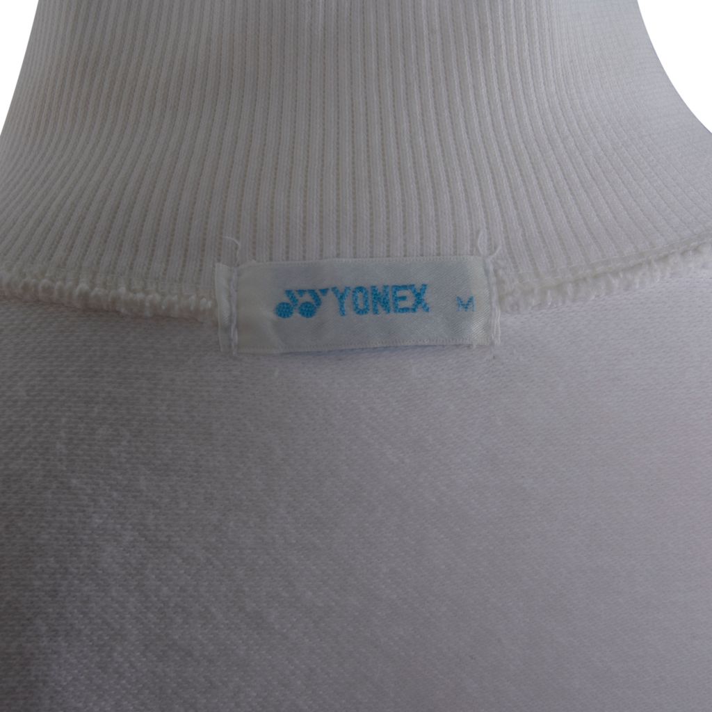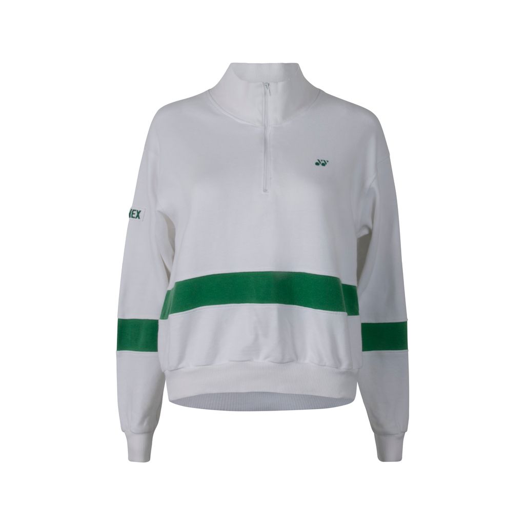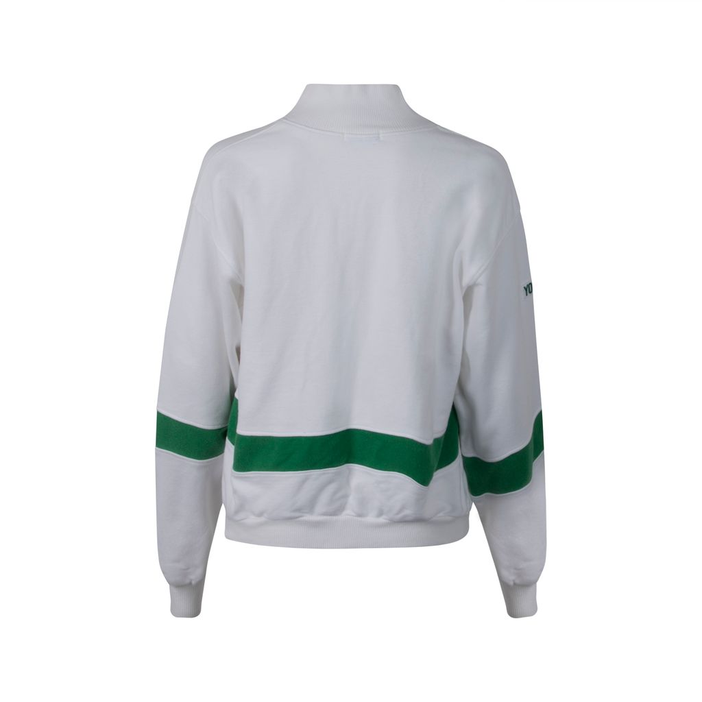 This vintage inspired half-zip sweater from Japanese athletic brand, Yonex, features a ribbed mock-neck, front half-zip closure, long ribbed cuff sleeves, ribbed hemline, and a green banding detail seen throughout the waist and sleeves. Embroidered Yonex branding is also seen on the front left chest and right sleeve. Gently worn, in good condition. Has a slightly cropped silhouette.