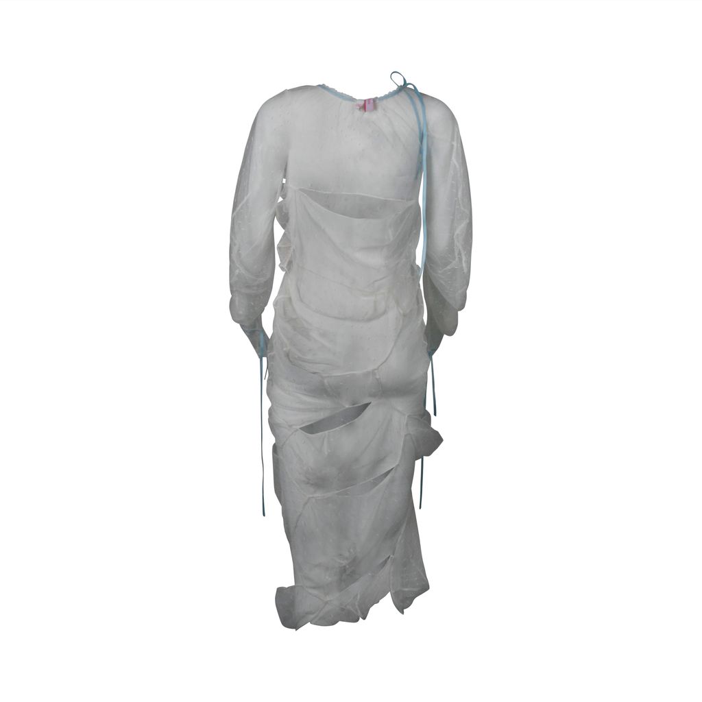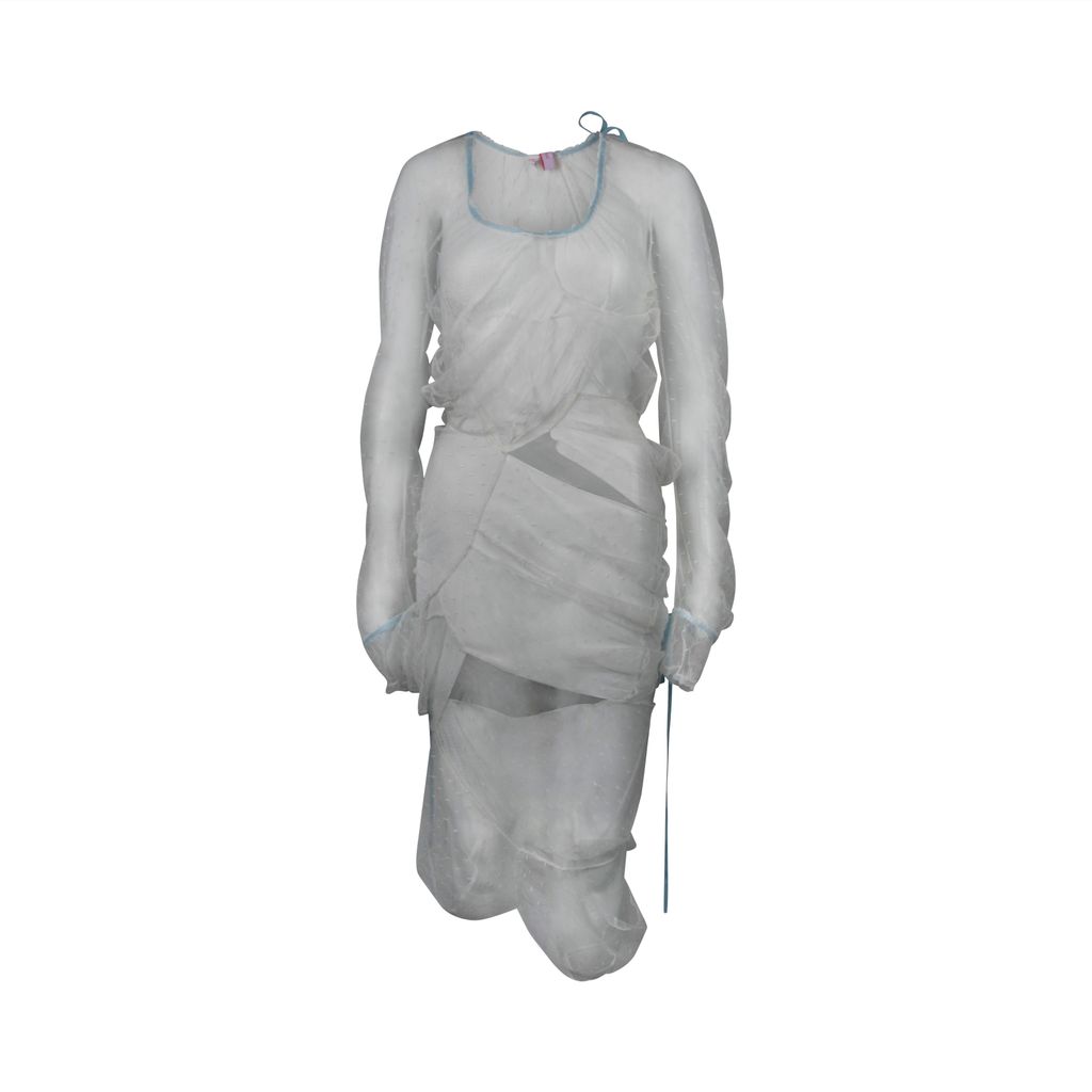 This lace dress by Yuhan Wang is fully transparent and features a ruched cut-out silhouette and baby blue trimmed scoop neckline. This dress is brand new in excellent condition, tags still attached.