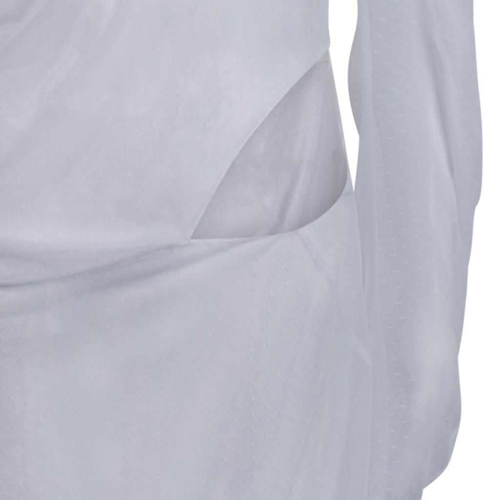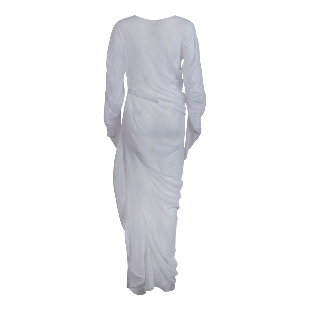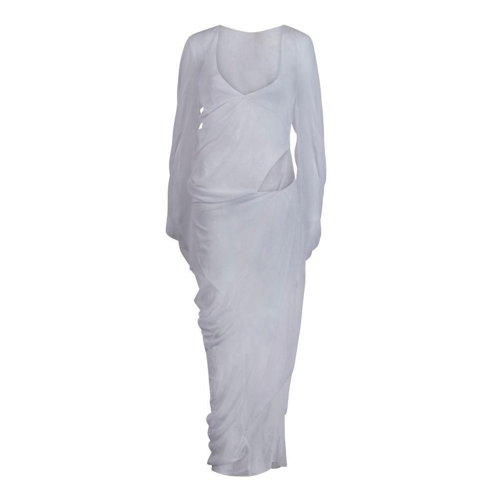 This delicate lace mesh dress by Yuhan Wang is fully transparent and features a side waist cut-out and v-cut neckline. This dress is sectioned forming a draped, hugging silhouette. Brand new in excellent condition, tags still attached.