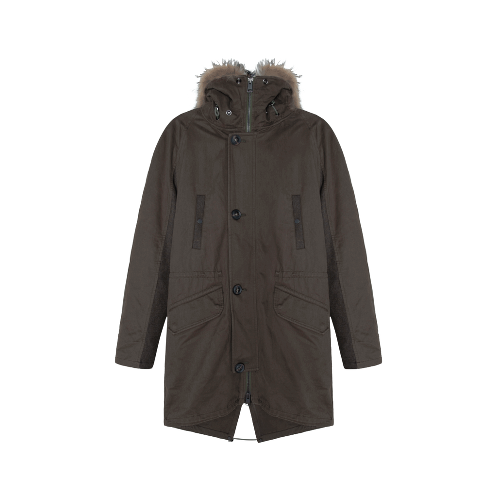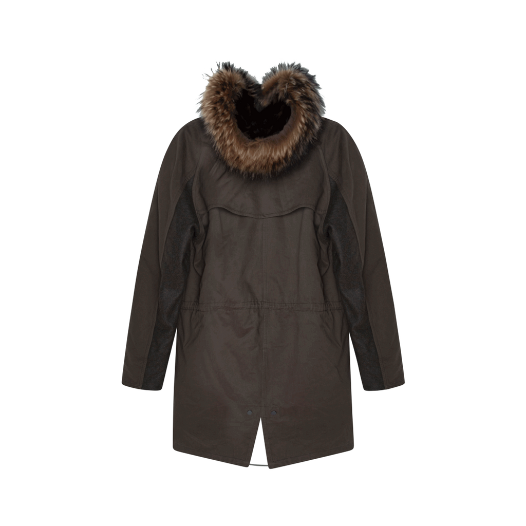 Yves Salomon Shearling Trim Hooded Parka features padded design, fur lining, drawstring hood, concealed front button fastening, internal drawstring fastening waist, 2 chest welt pockets, and 2 side flap pockets.