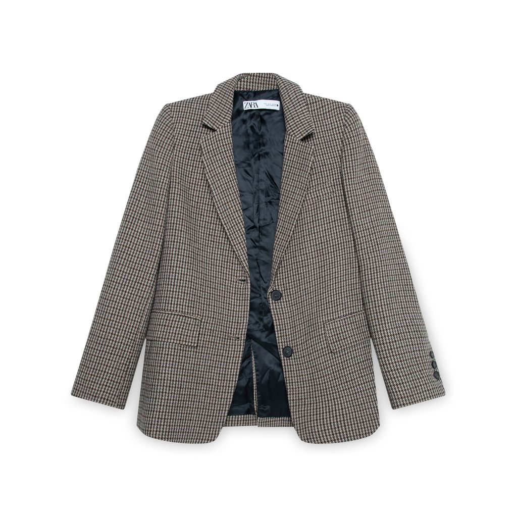 Zara Brown Tweed Blazer features shoulder pads, front button closure, and 2 faux pockets.