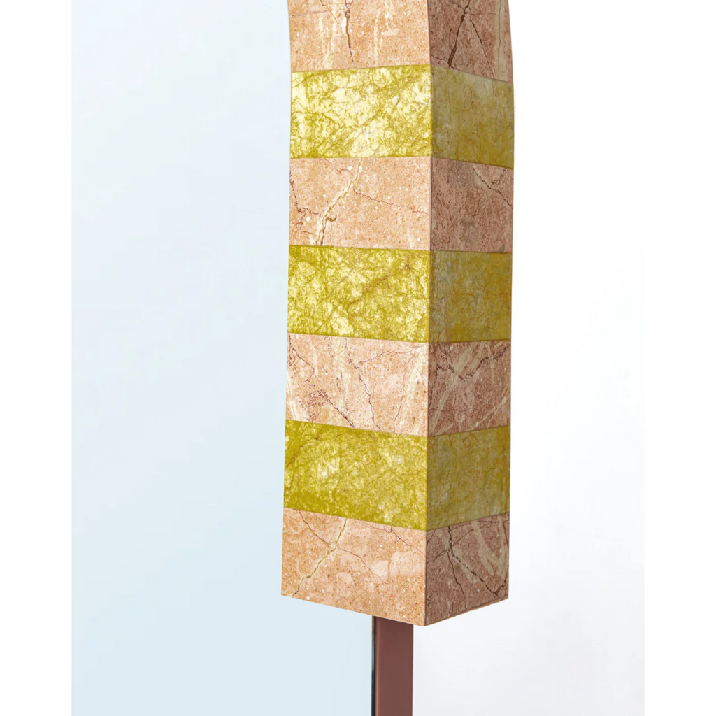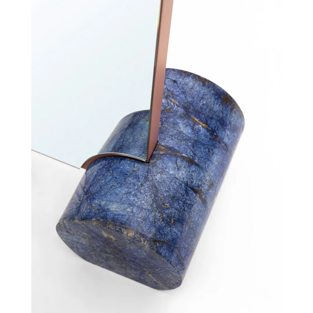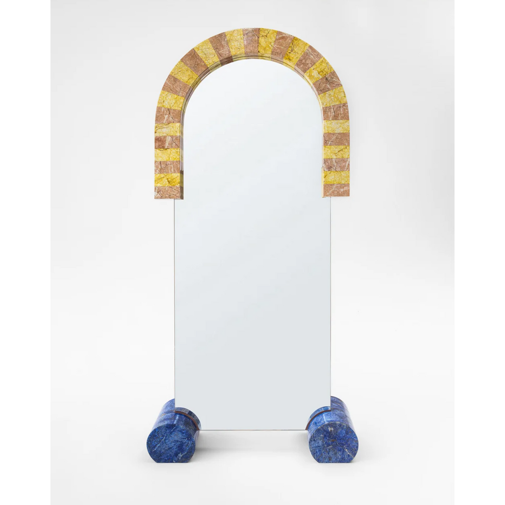 “Zaziko Mirror” resembles a giant colorful toy made out of marble. Zaziko is handcrafted and assembled with pink and yellow marble creating a semi arch shape around the clear mirror. This cartoonish piece invites you to take a look at yourself in a new way.